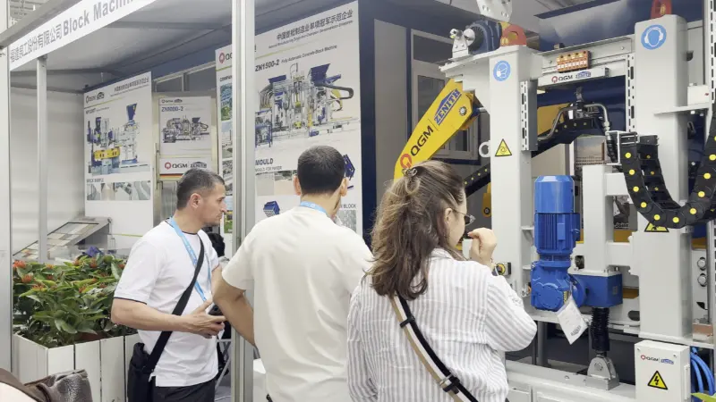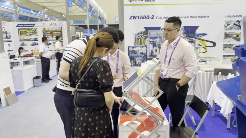 At this exhibition, Quangong Machinery Co., Ltd. set up both indoor and outdoor exhibition areas, systematically presenting its overall solutions from equipment R&D and intelligent manufacturing to finished product applications through a multi-dimensional and comprehensive display. The ZN1000-2 concrete product molding machine was a key exhibit, along with various specifications and types of brick samples, including paving bricks, hollow bricks, and solid bricks, visually demonstrating the equipment's superior performance in molding accuracy, product quality, and diversified production.